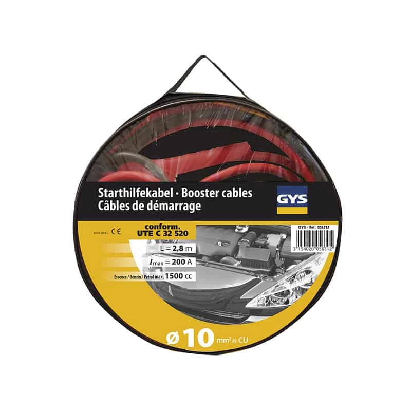 Les câbles de démarrage « 200A » de GYS conviennent aux voitures 1.5 l. Ils font 2,80 mètres de long et 10mm² de diamètre.